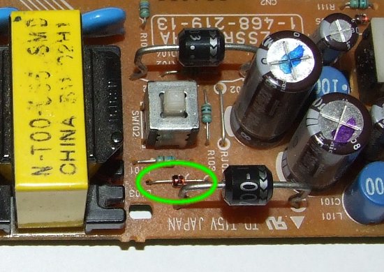 Przeglądając wszystkie elementy na drodze zaznaczonej na zdjęciu stwierdziłem że najsłabszym elementem są diody. Sprawdzając wszystkie po kolej multimetrem znalazłem winowajcę, diodę zenera.