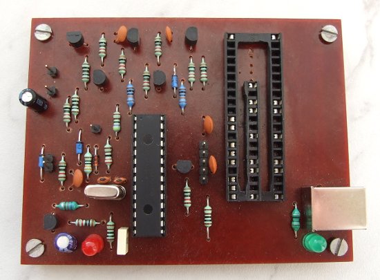 Krótka praca z programatorem na LPT spowodowała że zacząłem szukać w internecie rozwiązania lepszego, programatora na USB. Nie szukałem długo ponieważ autor programu PBrennerNG stworzył bardzo dobry programator Brenner8P na USB wraz z softem US-Burn (program dostępny jest zarówno na system Windows jak i Linux). Programator oparty jest o mikrokontroler PIC18F2550 który sprzętowo obsługuje interfejs USB, ponadto wyeliminowany został problem z zewnętrznym zasilaniem ponieważ na płytce znajduje się przetwornica która zwiększa napięcie programowania w zależności od wykrytego uC. Strona autora zawiera pełną dokumentację potrzebną do wykonania tego programatora (wzór PCB, lista części, schemat ideowy, wsad do mikrokontrolera).
